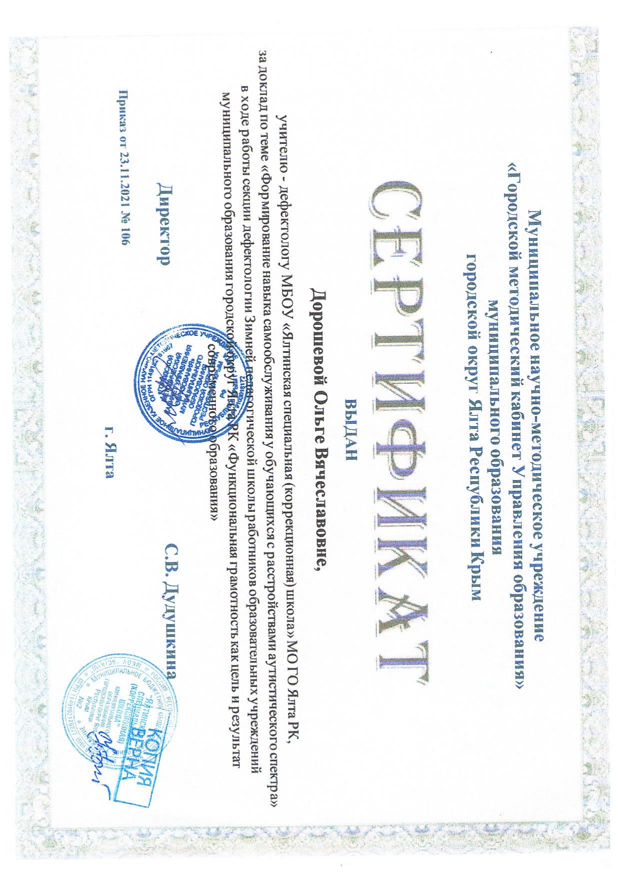 23.11.2021 г. доклад на секции дефектологии Зимней педагогической школы работников ОУ МОГО Ялта РК «Функциональная грамотность как цель и результат современного образования» на тему «Формирование навыков самообслуживания у обучающихся с РАС» (сертификат участника от 23.11.2021 г. приказ № 106)