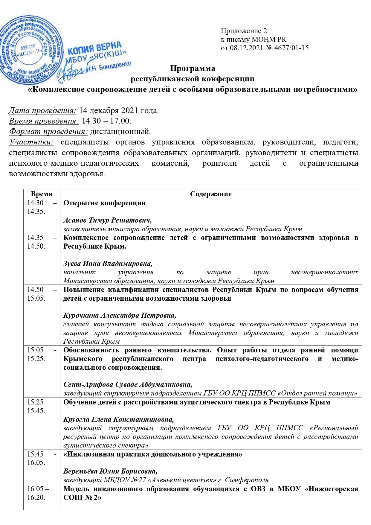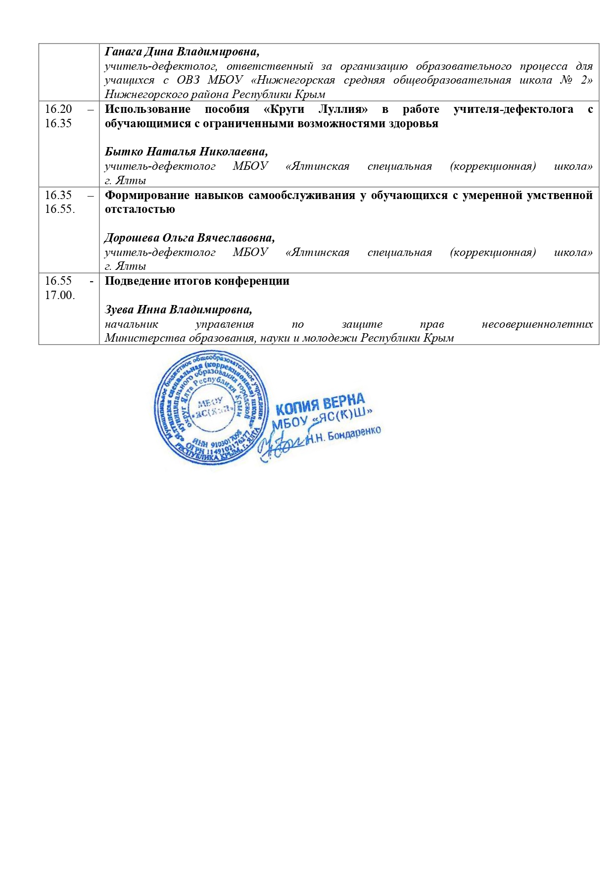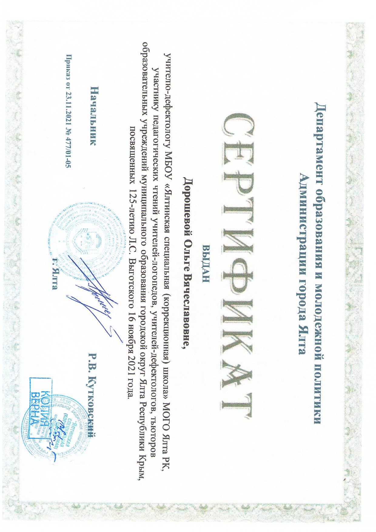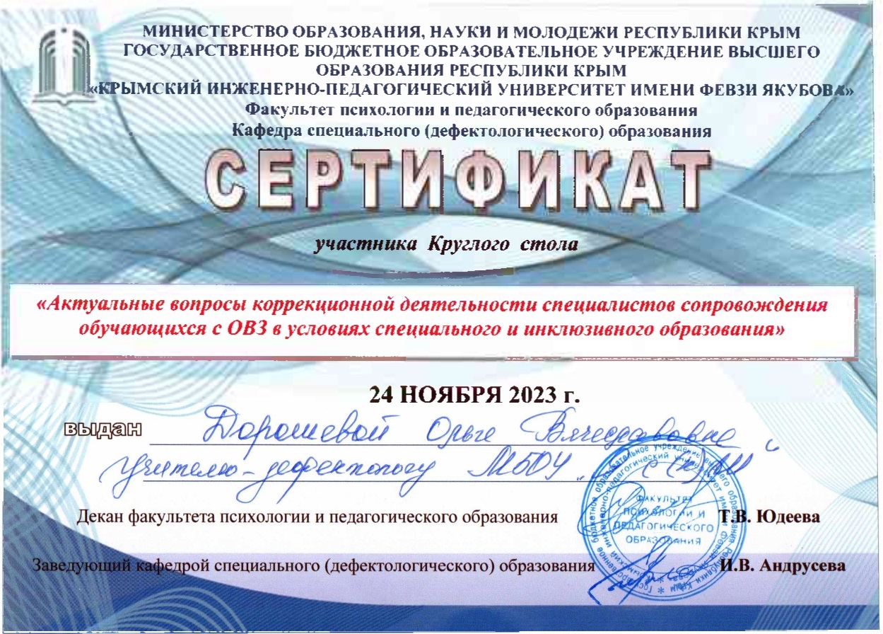 16.11.2021 г. доклад в рамках проведения педагогических чтений учителей-логопедов, учителей-дефектологов, тьюторов ОУ МО ГО Ялта РК, посвященных 125-летию Л.С. Выготского, на тему «Эффективные приемы по установлению сотрудничества с детьми с РАС» (сертификат участника от 23.11.2021 г. приказ № 477/01-05)