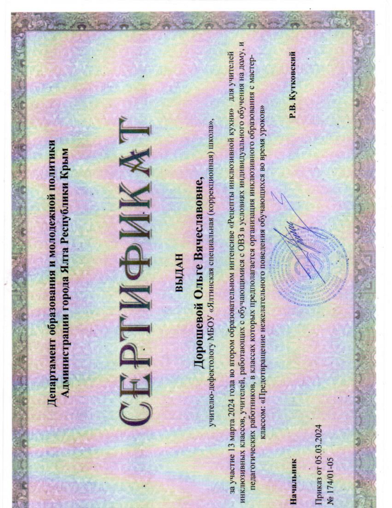 13.03.2024 г. Второй образовательный интенсив «Рецепты инклюзивной кухни» для учителей инклюзивных классов, учителей, работающих с обучающимися на дому, мастер-класс на тему «Предотвращение нежелательного поведения обучающихся во время урока» (сертификат от 05.03.2024 г. приказ № 174/01-05)