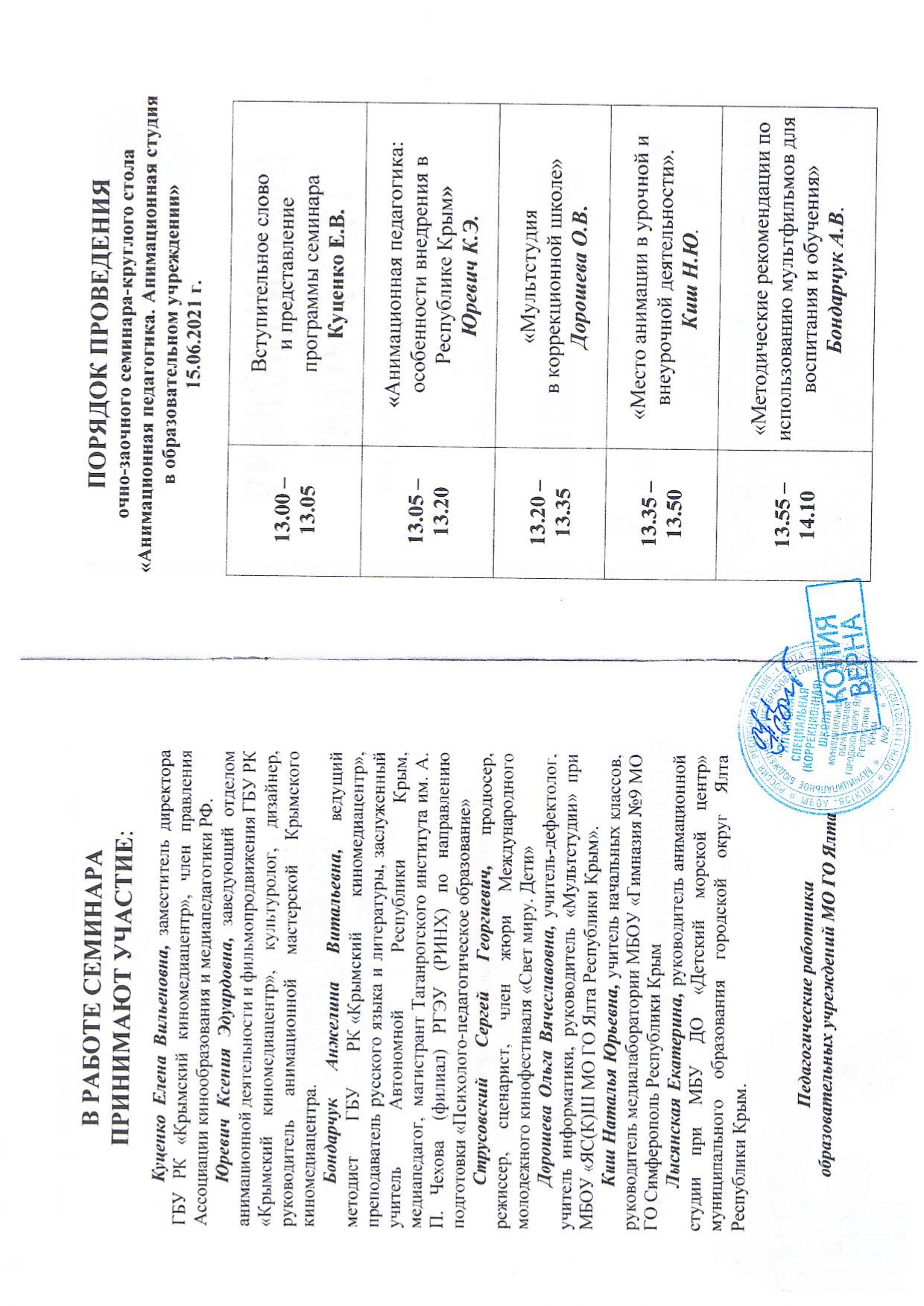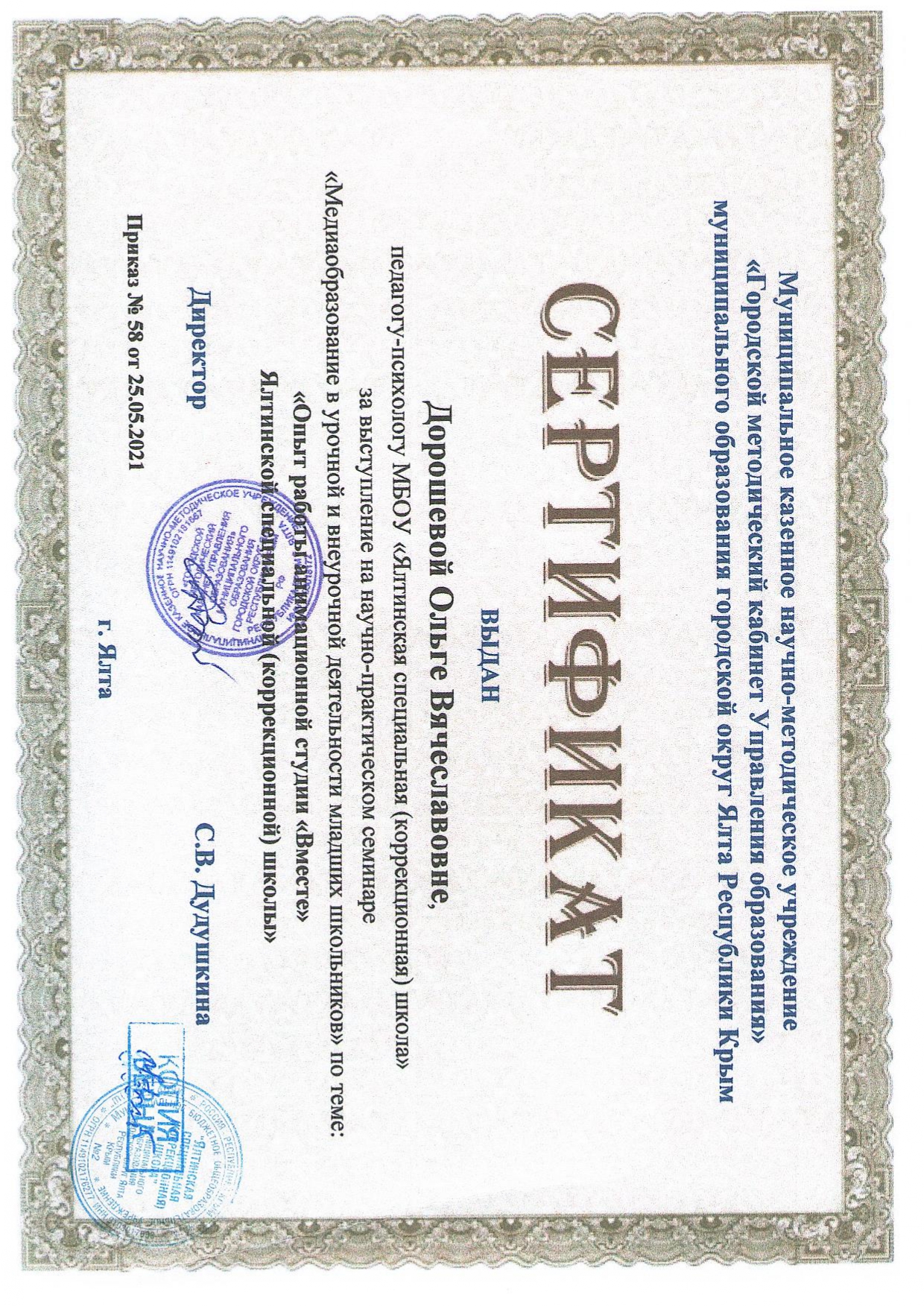 25.05.2021 г. доклад на научно-практическом семинаре «Медиаобразование в урочной и внеурочной деятельности младших школьников» по теме: «Опыт работы анимационной студии «Вместе» «МБОУ ЯС(К)Ш» (сертификат участника от 25.05.2021 г, приказ № 58)