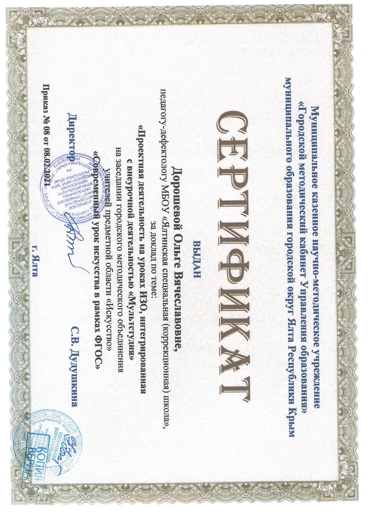 08.02.2021 г. доклад на заседании городского МО учителей предметной области «Искусство» на тему «Современный урок искусства в рамках ФГОС» (сертификат участника от 08.02.2021 г, приказ № 08)