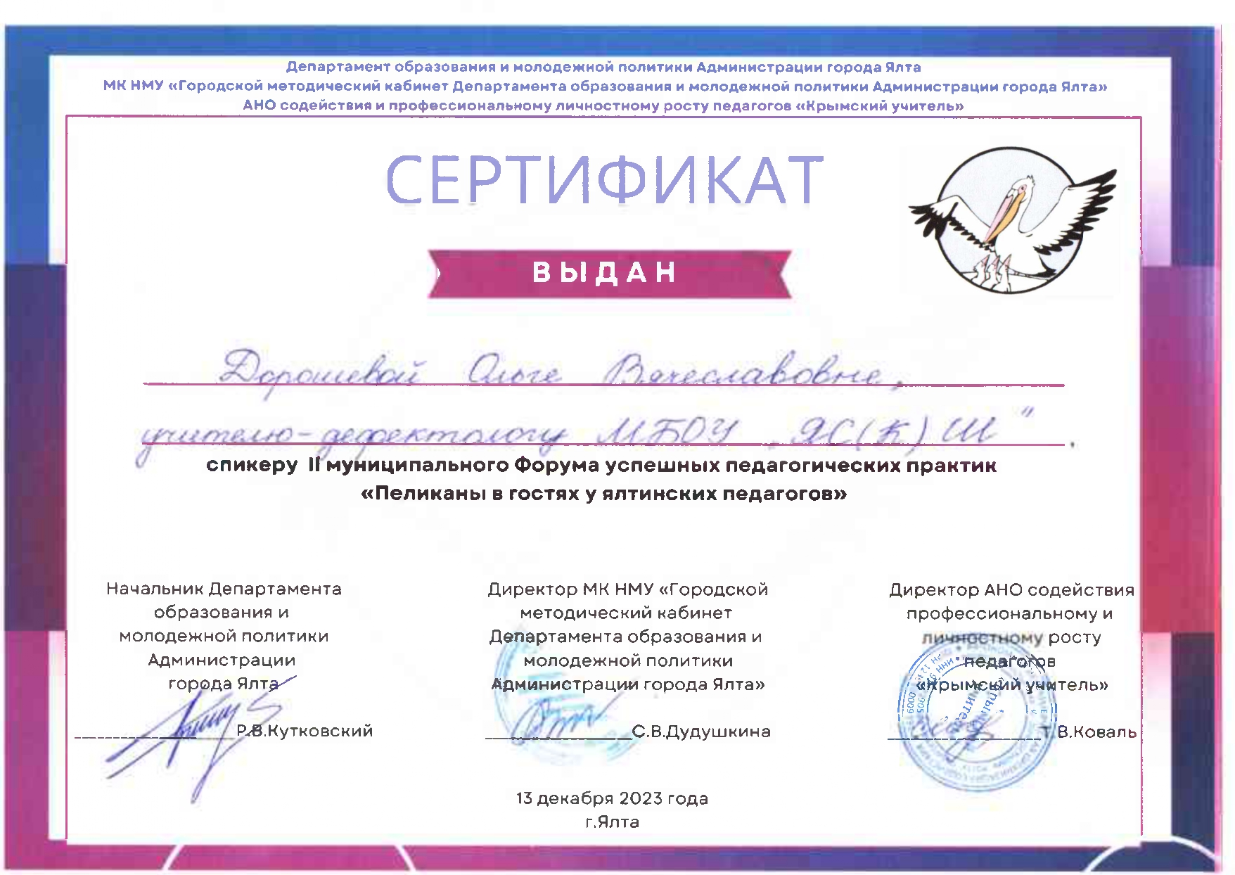 13.12.2023 г. II муниципальный форум успешных педагогических практик «Пеликаны в гостях у ялтинских педагогов» доклад на тему «Мультипликация как инструмент учителя-дефектолога»