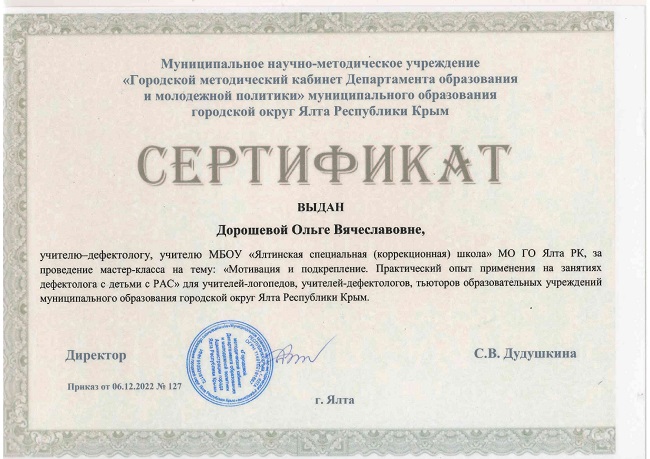 14.12.2022 г. мастер-класс на тему «Мотивация и подкрепление. Практический опыт применения на занятиях дефектолога с детьми с РАС»» для учителей-логопедов, учителей-дефектологов, тьюторов ОУ МО ГО Ялта РК. (сертификат от 06.12.2022 г. приказ № 127)