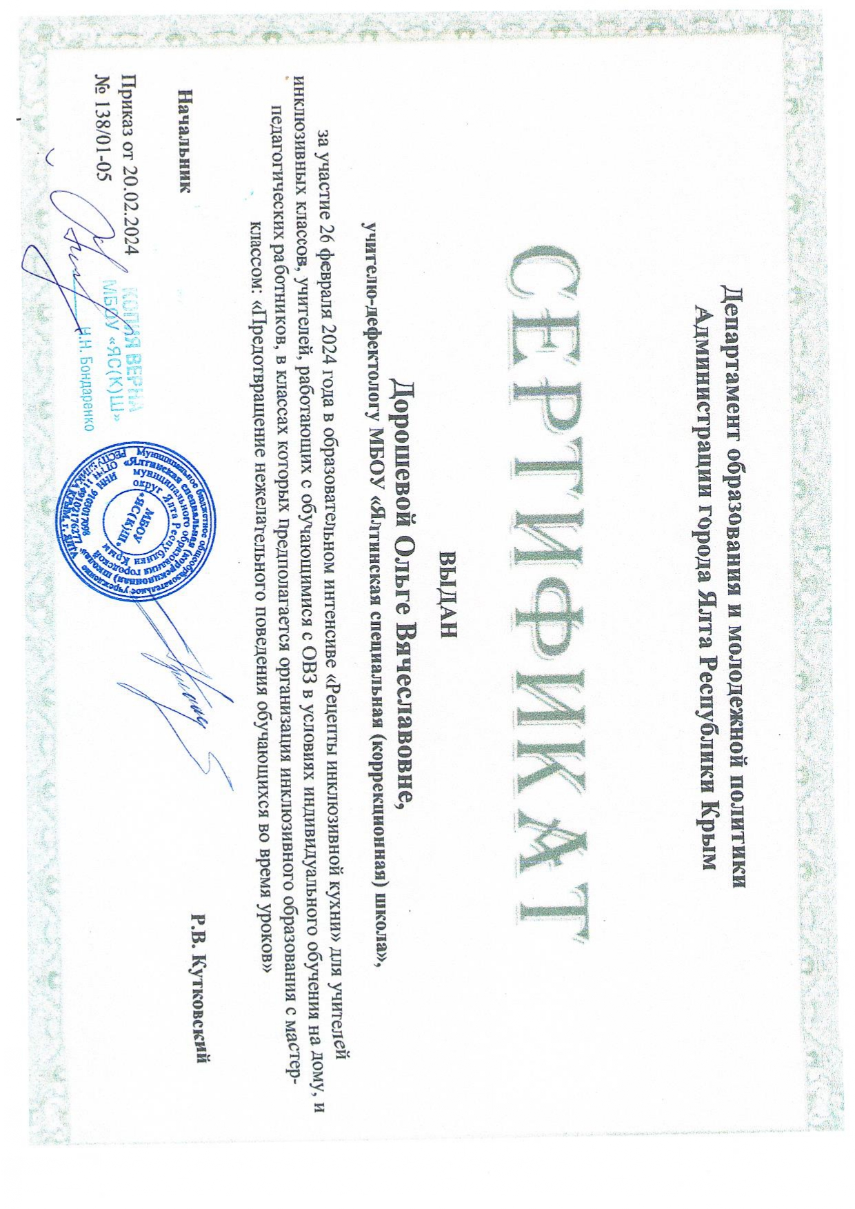 20.02.2024 г. Образовательный интенсив «Рецепты инклюзивной кухни» для учителей инклюзивных классов, учителей, работающих с обучающимися на дому, мастер-класс на тему «Предотвращение нежелательного поведения обучающихся во время урока» (сертификат от 20.02.2024 г. приказ № 138/01-05)