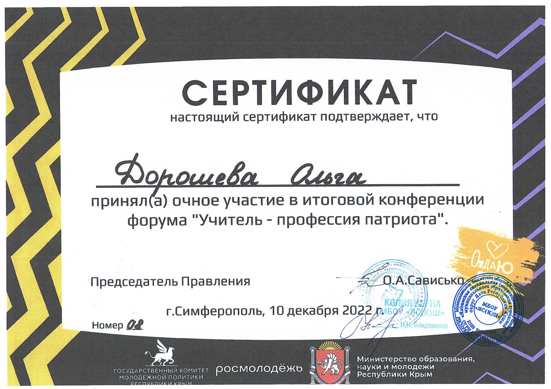 10.12.2022 г. мастер-класс на тему "Поведенческие технологии в педагогической практике" на региональном форуме "Учитель - профессия патриота" при поддержке Государственного комитета молодежной политики Республики Крым и АНО "Дом молодежи"