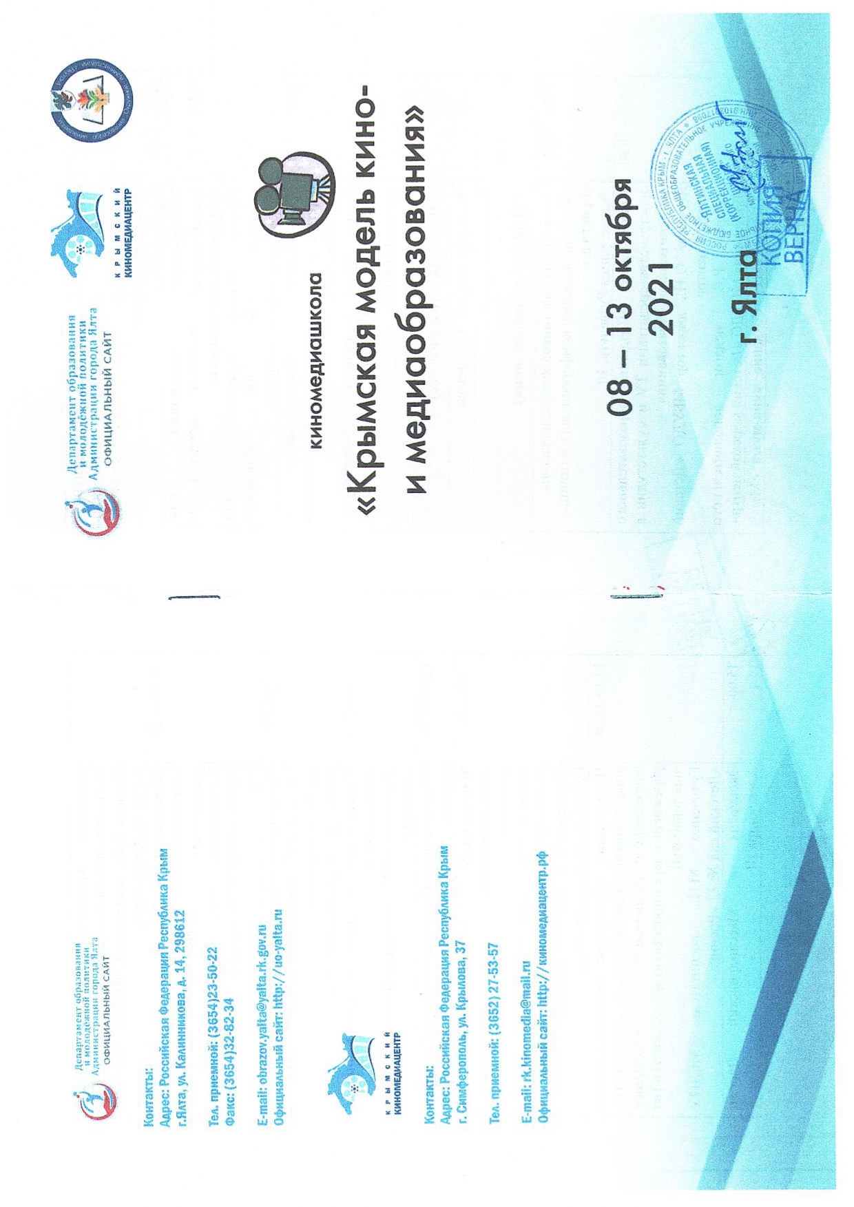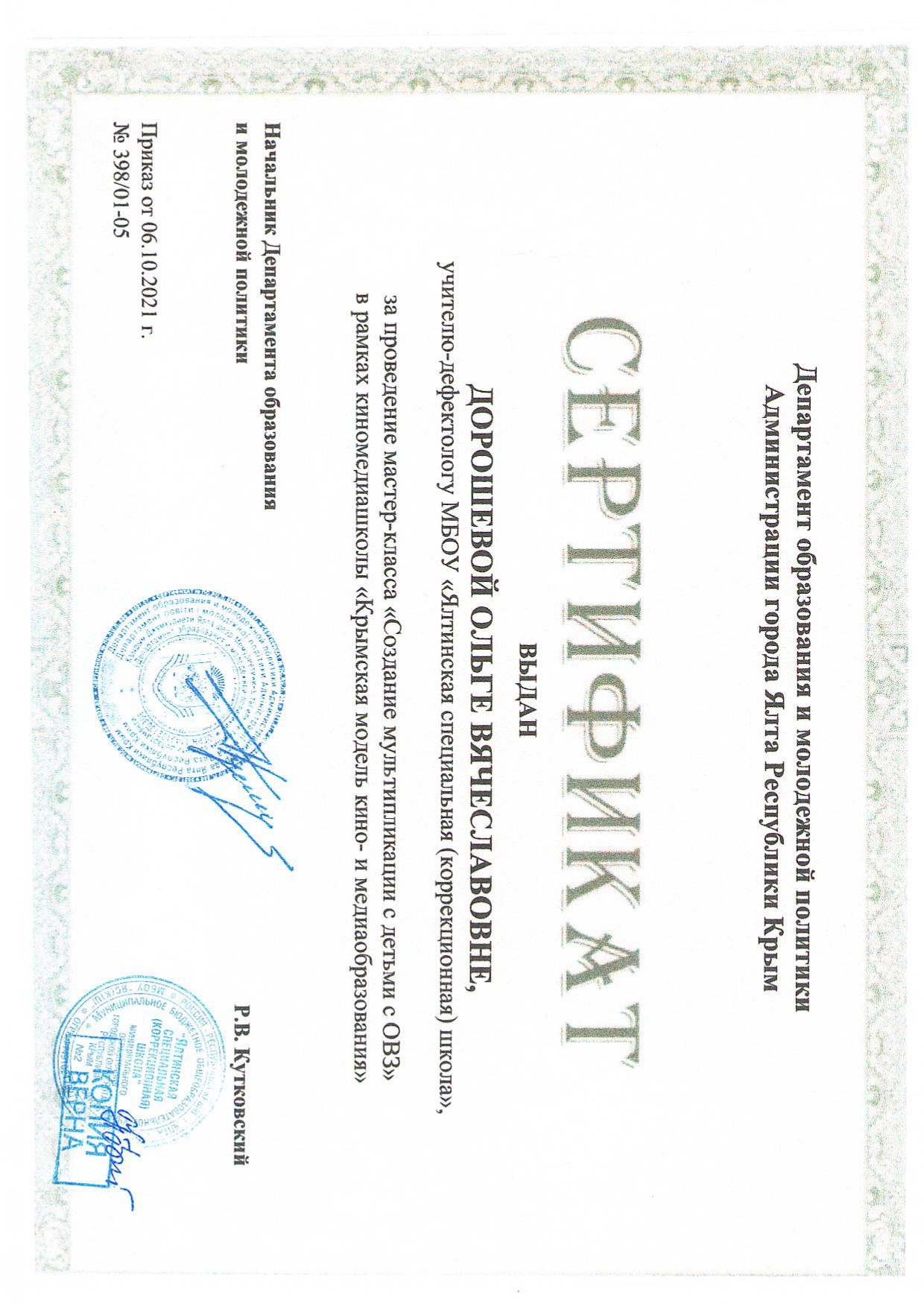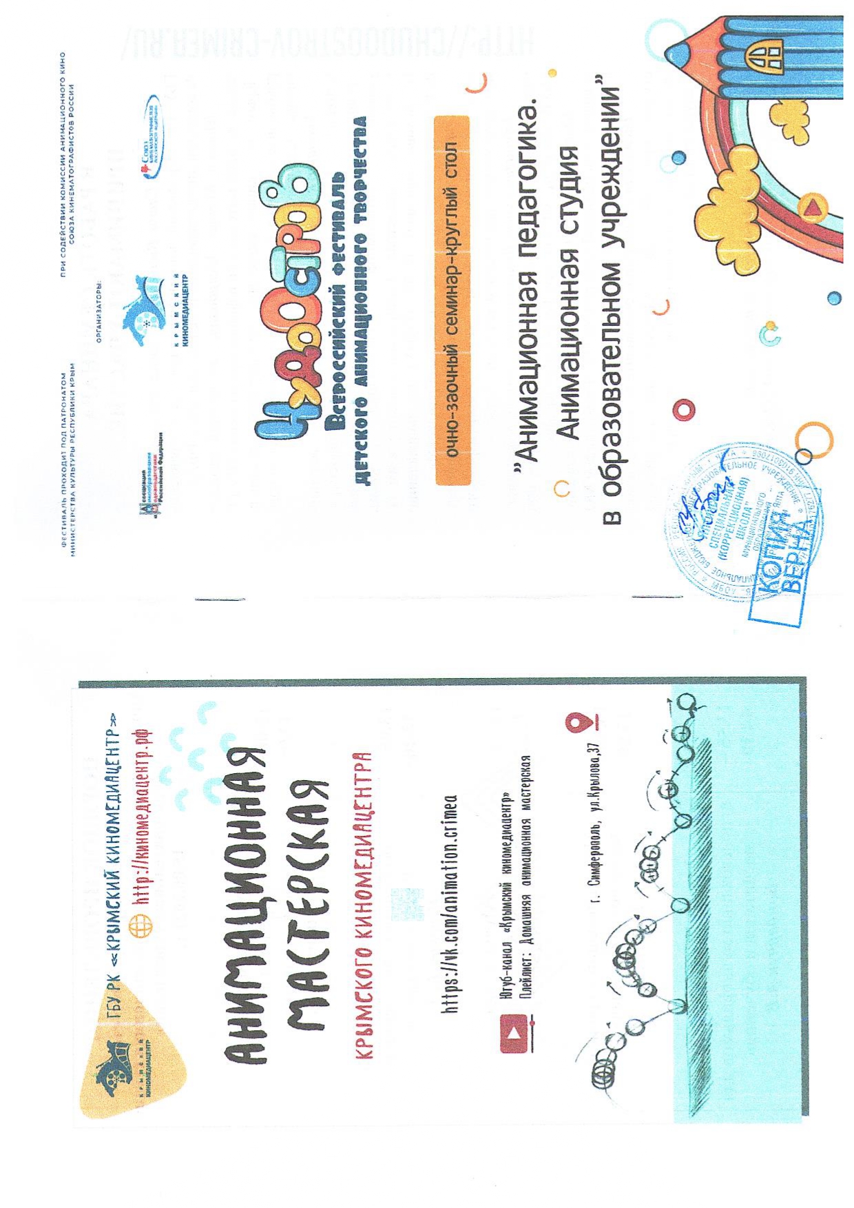 11.10.2021 г. мастер-класс «Создание мультипликации с детьми с ОВЗ» в рамках киномедиашколы «Крымская модель кино- и медиаобразования» (сертификат участника от 06.10.2021 г, приказ № 398/01-05)