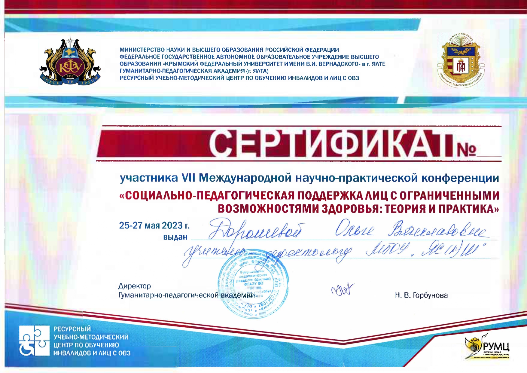 25-27.05.2023 VII Международная научно-практической конференции «Социально-педагогическая поддержка лиц с ограниченными возможностями здоровья: теория и практика» доклад на тему «Методический комплект для обучающихся имеющих интеллектуальные нарушения по курсу «Информатика» 7 класс»