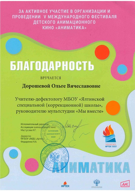 Сертификат о проведении занятий по дополнительной общеразвивающей программе на V Международном фестивале детского анимационного кино "АНИМАТИКА" в МДЦ «Артек» (36 часов) с 13 - 19.08.2022 г.