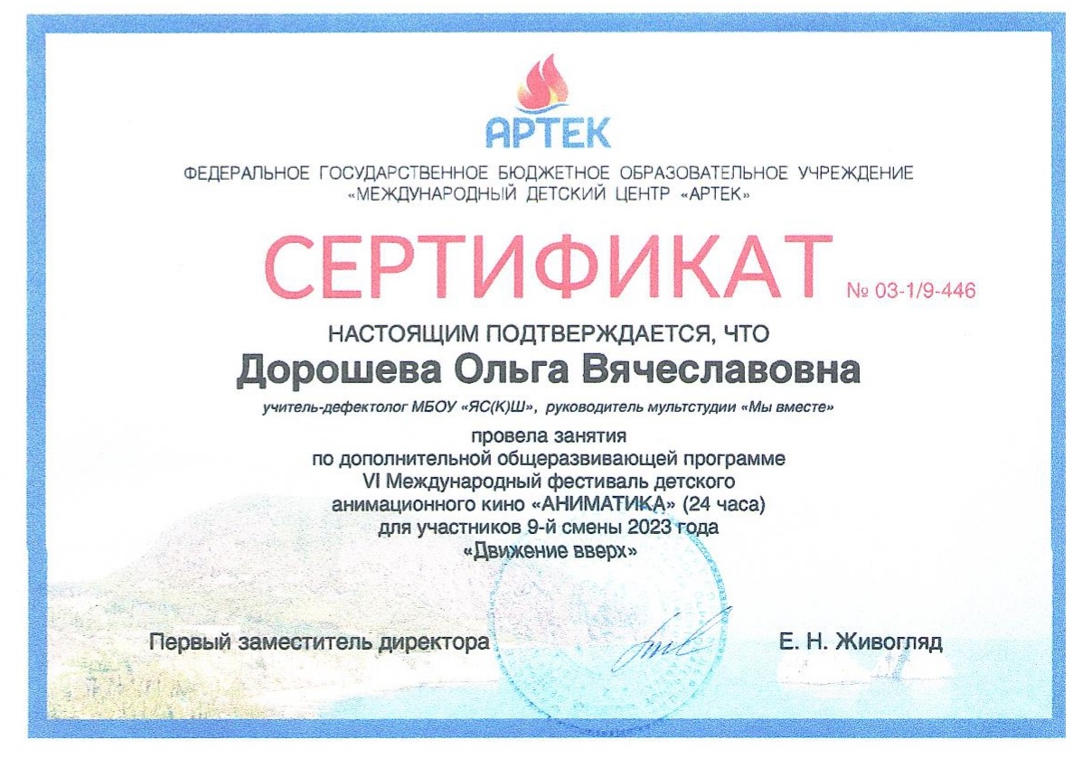Сертификат № 03-1/9-446 о проведении занятий по дополнительной общеразвивающей программе на VI Международном фестивале детского анимационного кино "АНИМАТИКА" в МДЦ «Артек» (24 часа) с 13 - 19.08.2023 г.