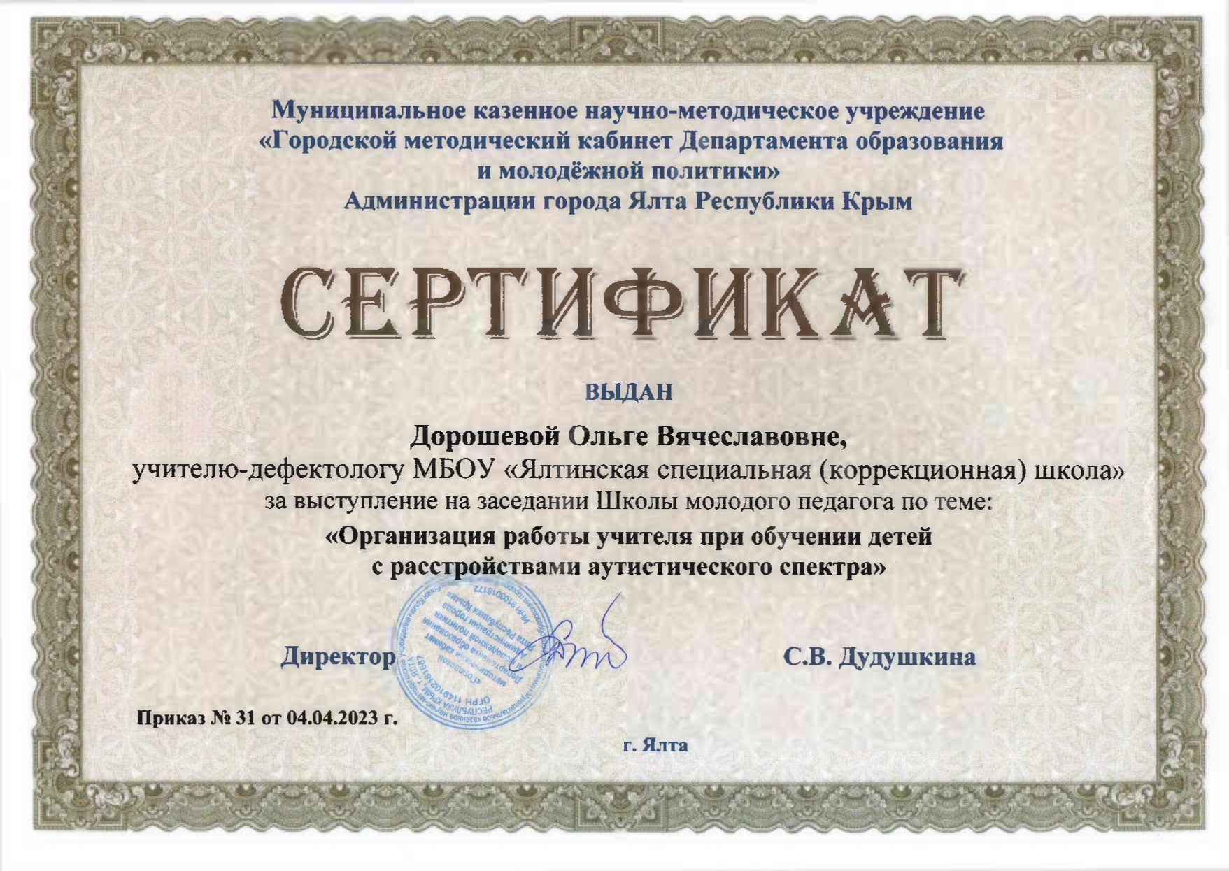 04.04.2023 Школа молодого педагога муниципального образования г. Ялта выступление на тему «Организация работы учителя при обучении детей с РАС»