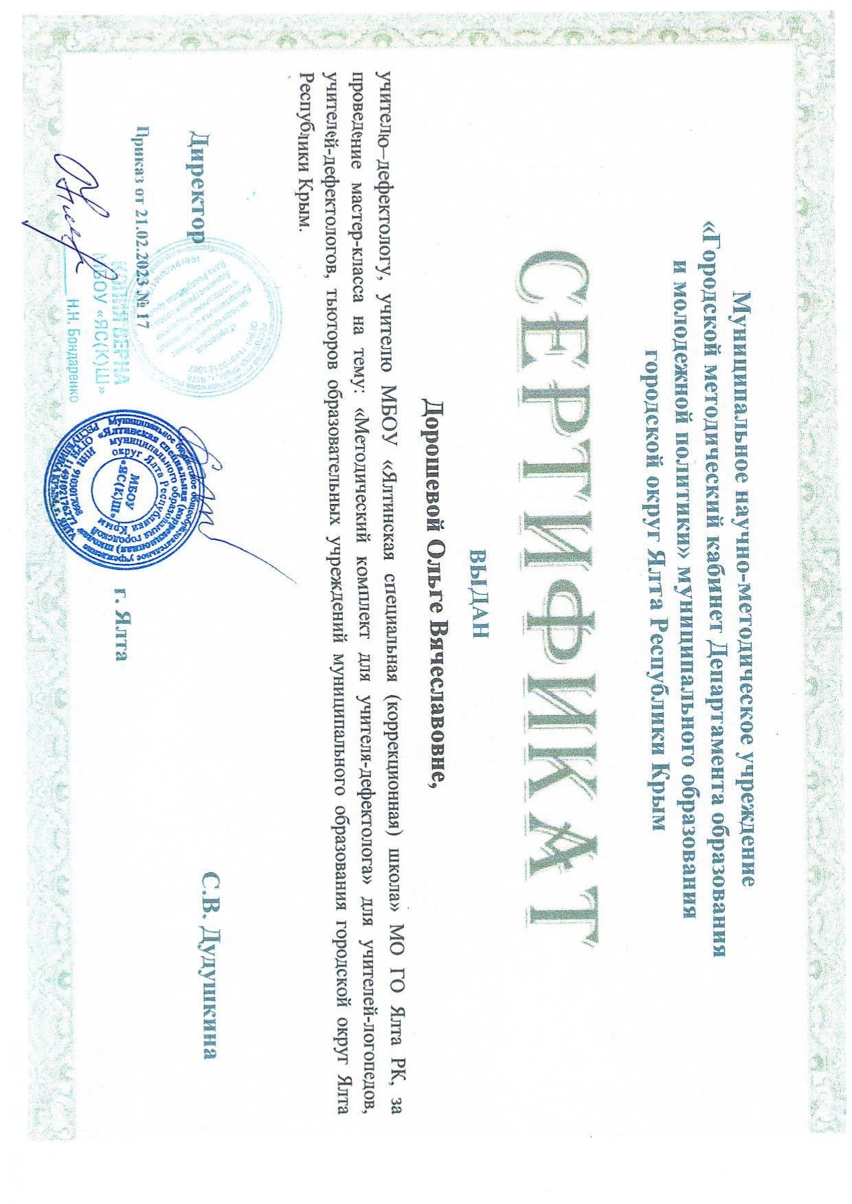 21.02.2023 мастер-класс на тему «Методический комплект учителя-дефектолога»» для учителей-логопедов, учителей-дефектологов, тьюторов ОУ МО ГО Ялта РК. (сертификат от 21.02.2023 г. приказ № 17)