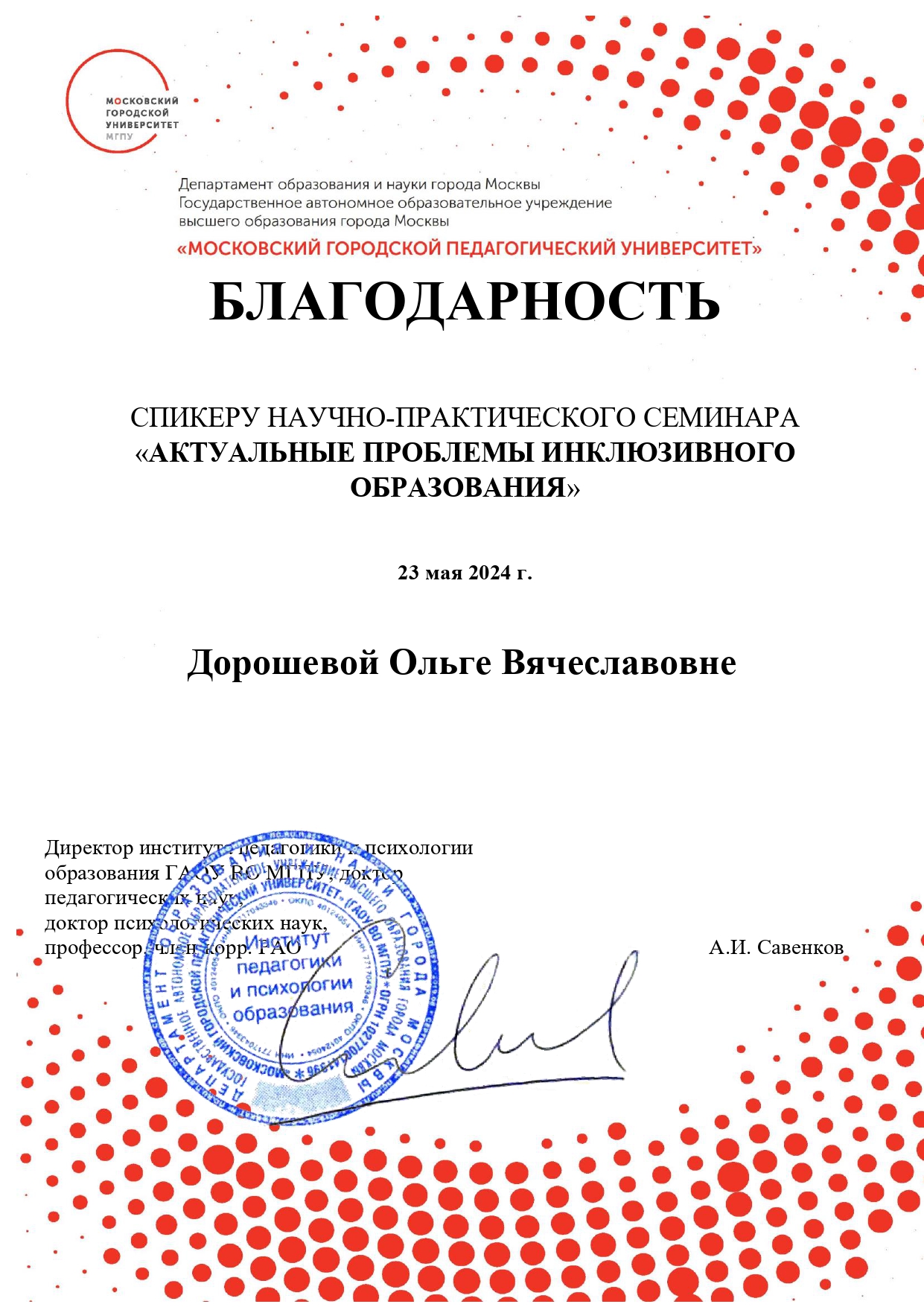 23.05.2024 Научно-практический семинар для студентов института педагогики и психологии образования Московского городского педагогического университета «Актуальные проблемы инклюзивного образования по теме: «Современные методы и приемы коррекционной и профилактической работы с учащимися с ограниченными возможностями здоровья» доклад на тему: «Мультипликация как инструмент развития познавательной сферы у обучающихся с ОВЗ»