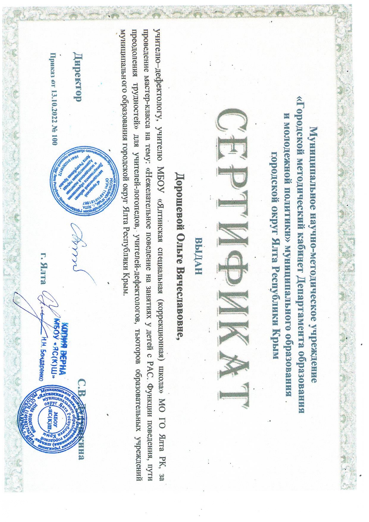 13.10.2022 г. мастер-класс на тему «Нежелательное поведение на занятиях у детей с РАС. Функции поведения, пути преодоления трудностей» для учителей-логопедов, учителей-дефектологов, тьюторов ОУ МО ГО Ялта РК. (сертификат от 13.10.2022 г. приказ № 100)