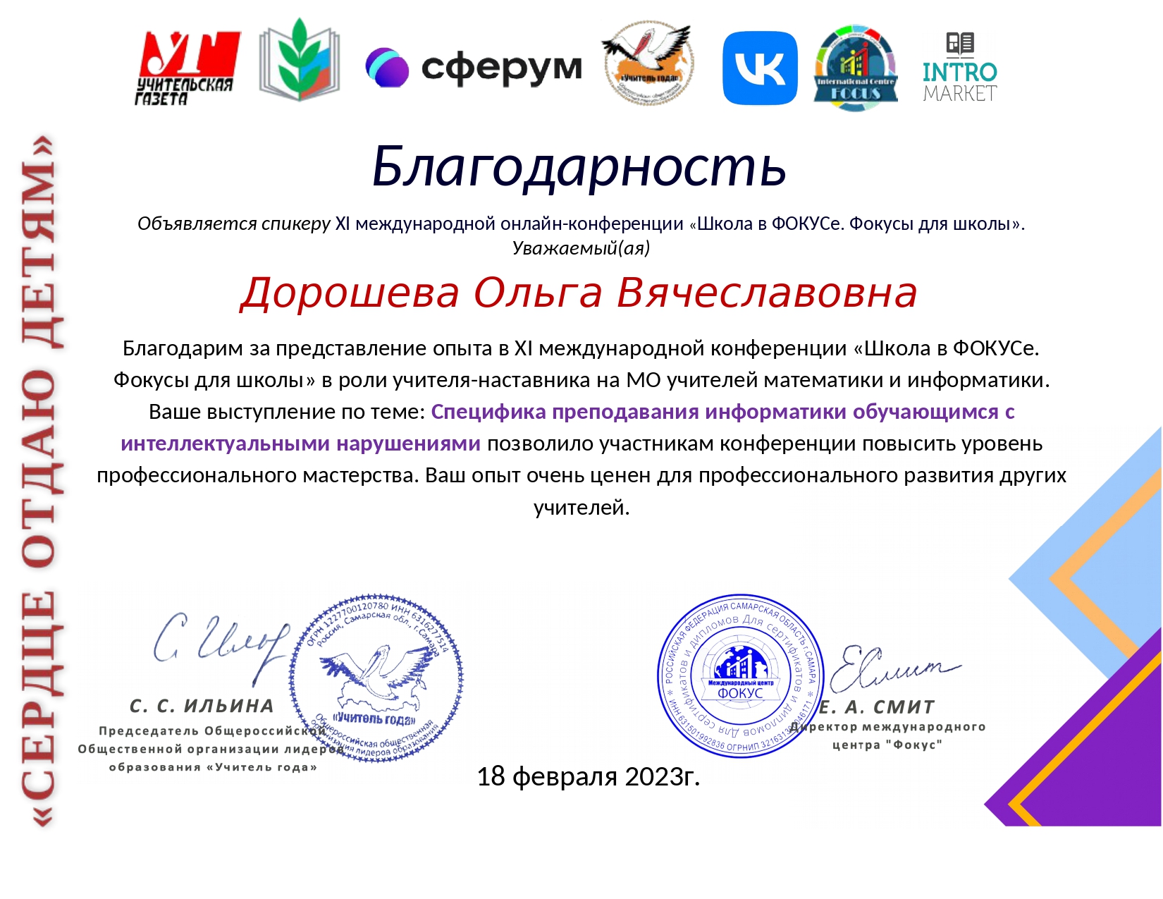 18.02.2023г. XI Международная онлайн-конференция «Школа в ФОКУСе. Фокусы для школы» доклад на тему «Специфика преподавания информатики для обучающихся с интеллектуальными нарушениями»