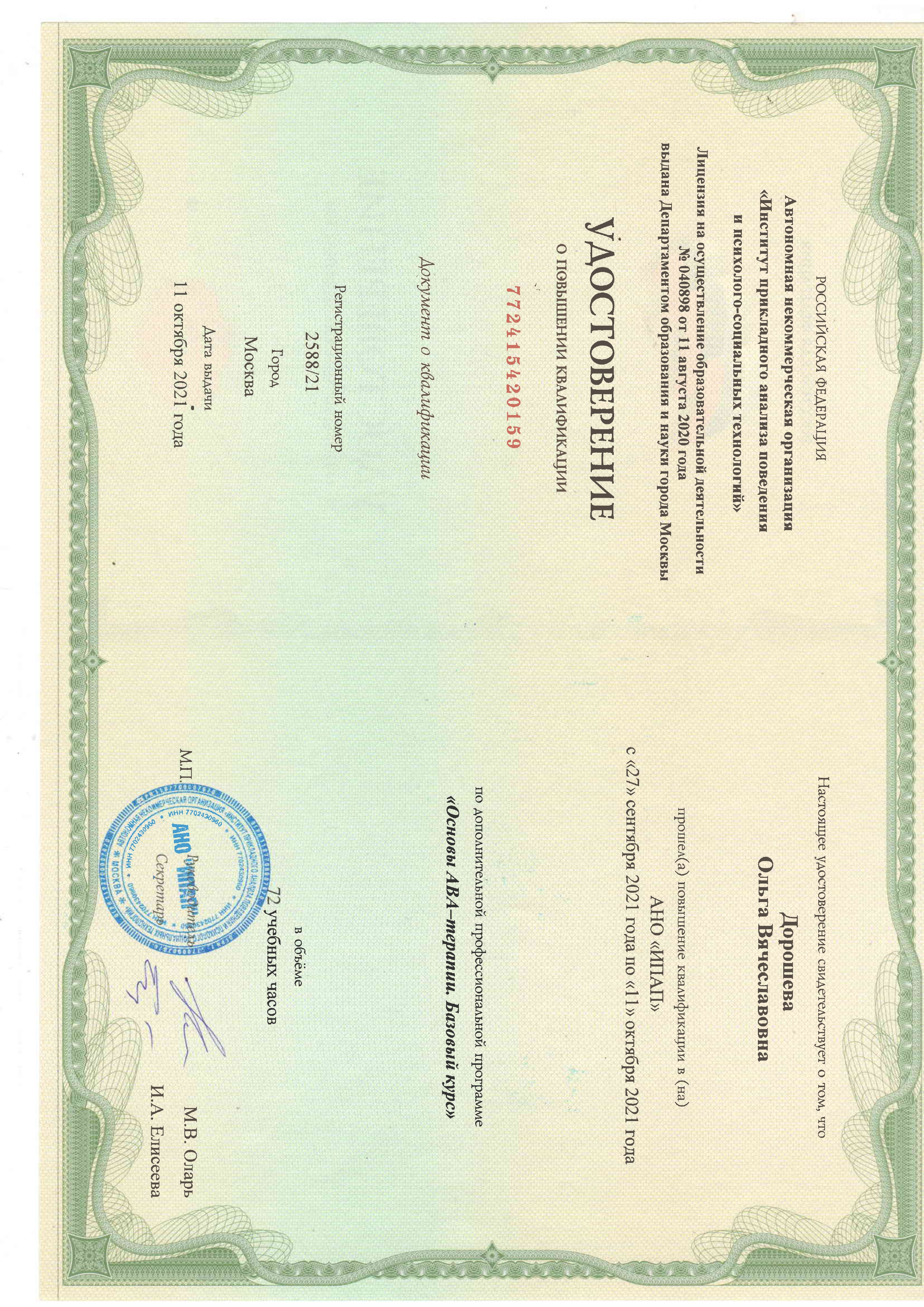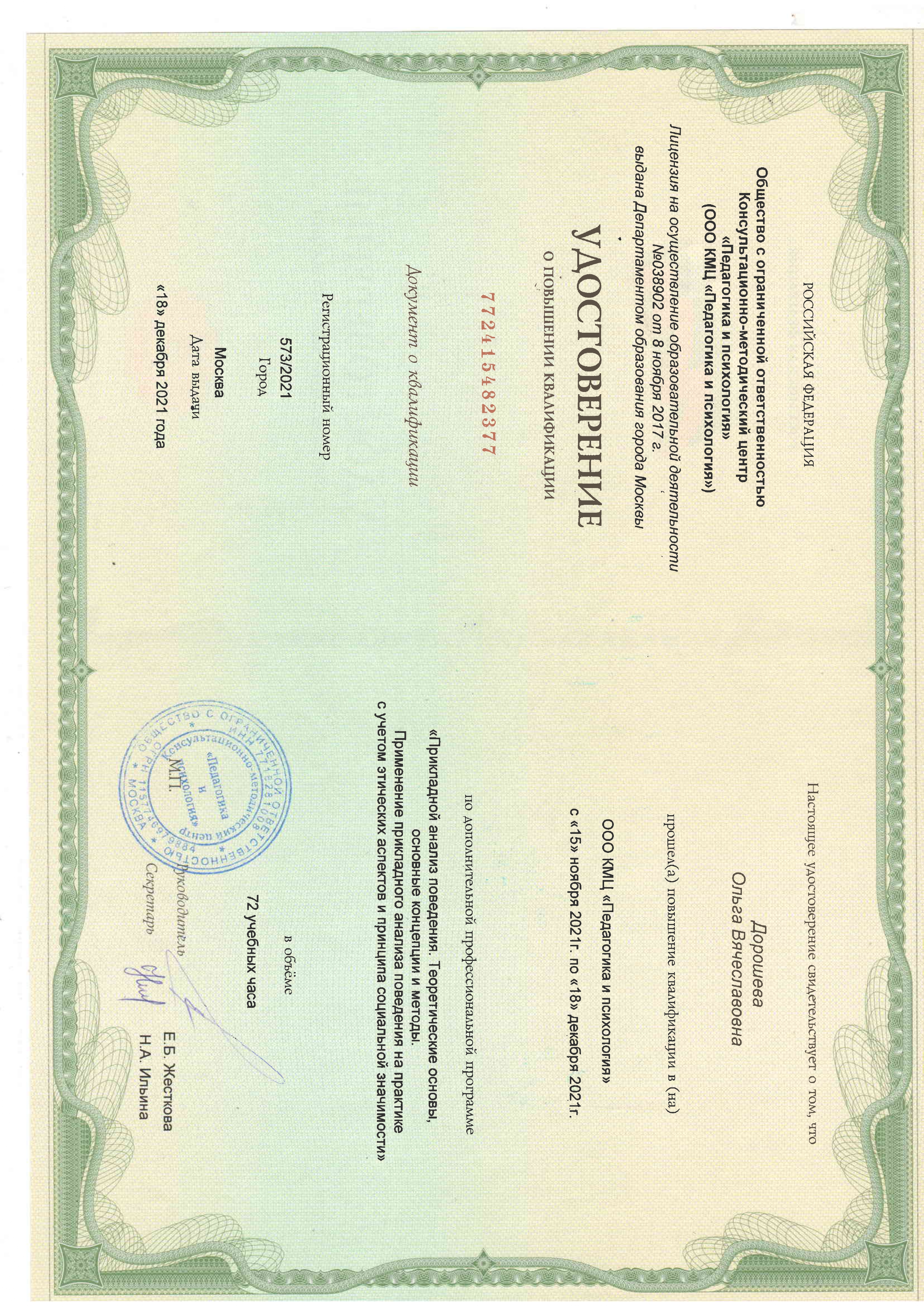 Удостоверение о повышении квалификации ООО КМЦ «Педагогика и психология» от 18.12.2021 г. регистрационный номер 573/2021 «Прикладной анализ поведения. Теоретические основы, основные концепции и методы. Применение прикладного анализа поведения на практике с учетом этических аспектов и принципа социальной значимости» в объеме 72 часа.