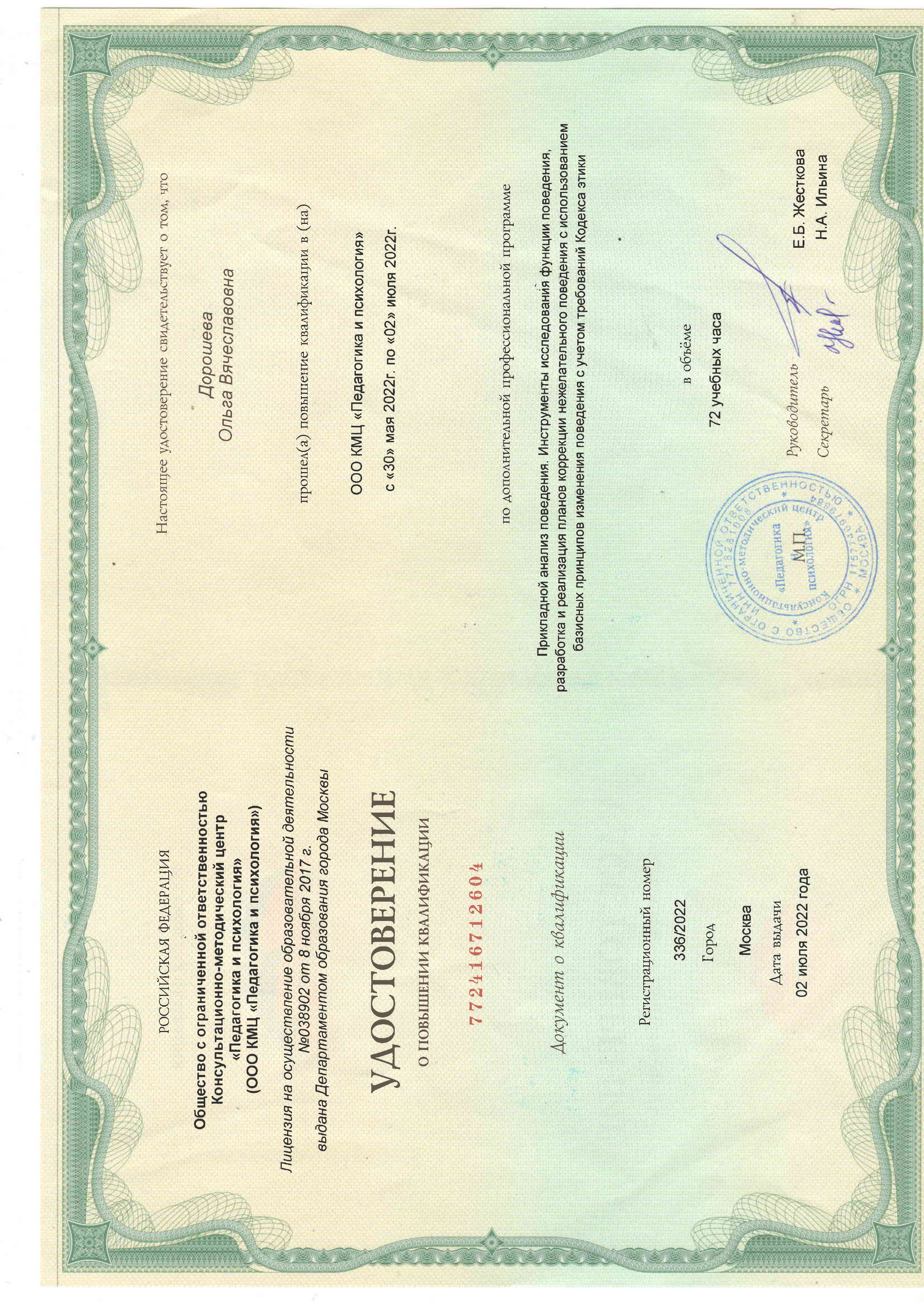 Удостоверение о повышении квалификации ООО КМЦ «Педагогика и психология» от 02.07.2022 г. регистрационный номер 336/2022 «Прикладной анализ поведения. Инструменты исследования функции поведения, разработка и реализация планов коррекции нежелательного поведения с использованием базисных принципов изменения поведения с учетом требования Кодекса этики» в объеме 72 часа.