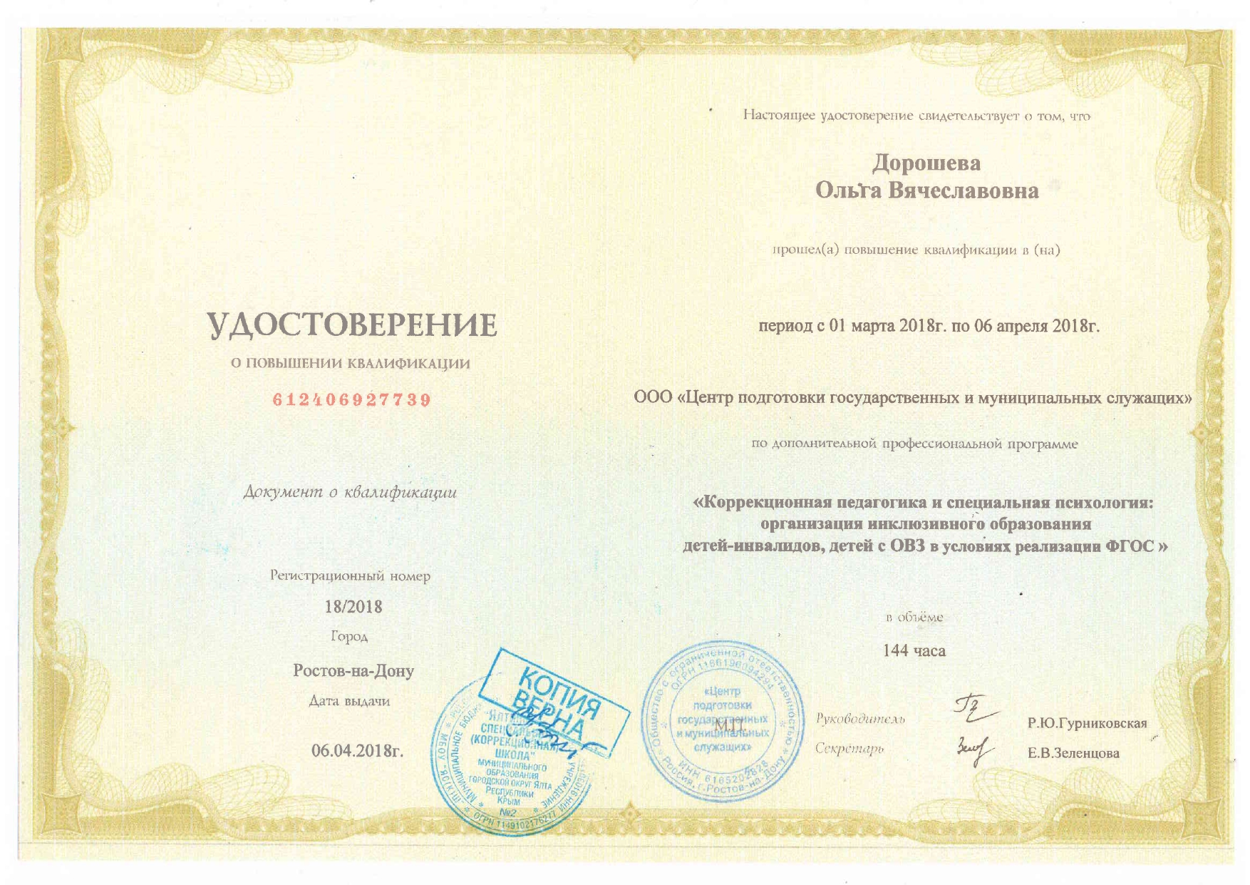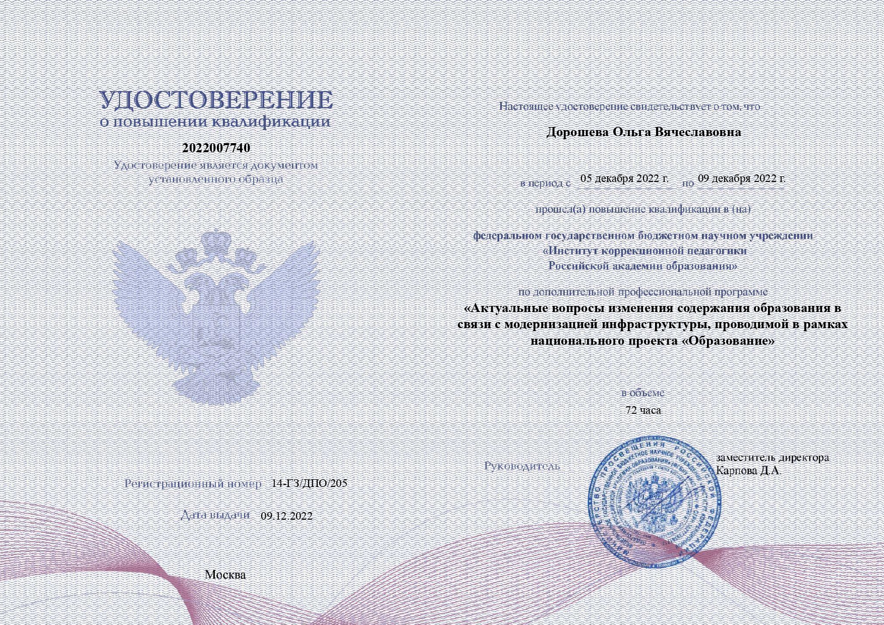 Удостоверение о повышении квалификации ФГБНУ «Институт коррекционной педагогики Российской академии образования» от 09.12.2022 г. регистрационный номер 14-ГЗ/ДПО/205 «Актуальные вопросы изменения содержания образования в связи с модернизацией инфраструктуры, проводимой в рамках национального проекта «Образование» в объеме 72 часа
