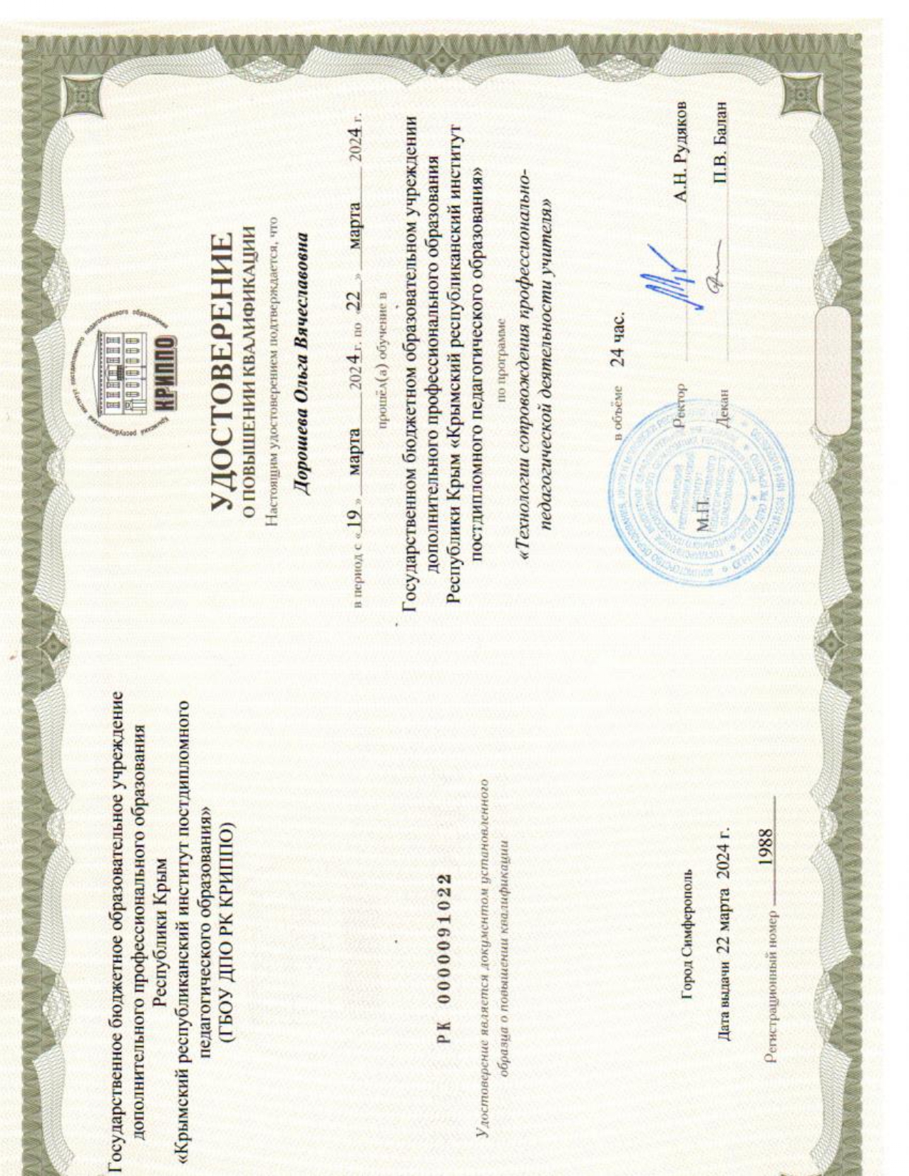 Удостоверение о повышении квалификации ГБОУ ДПО РК «КРИППО» от 22.03.2024 г. № 1988 «Технологии сопровождения профессионально-педагогической деятельности учителя» в объеме 24 часов.