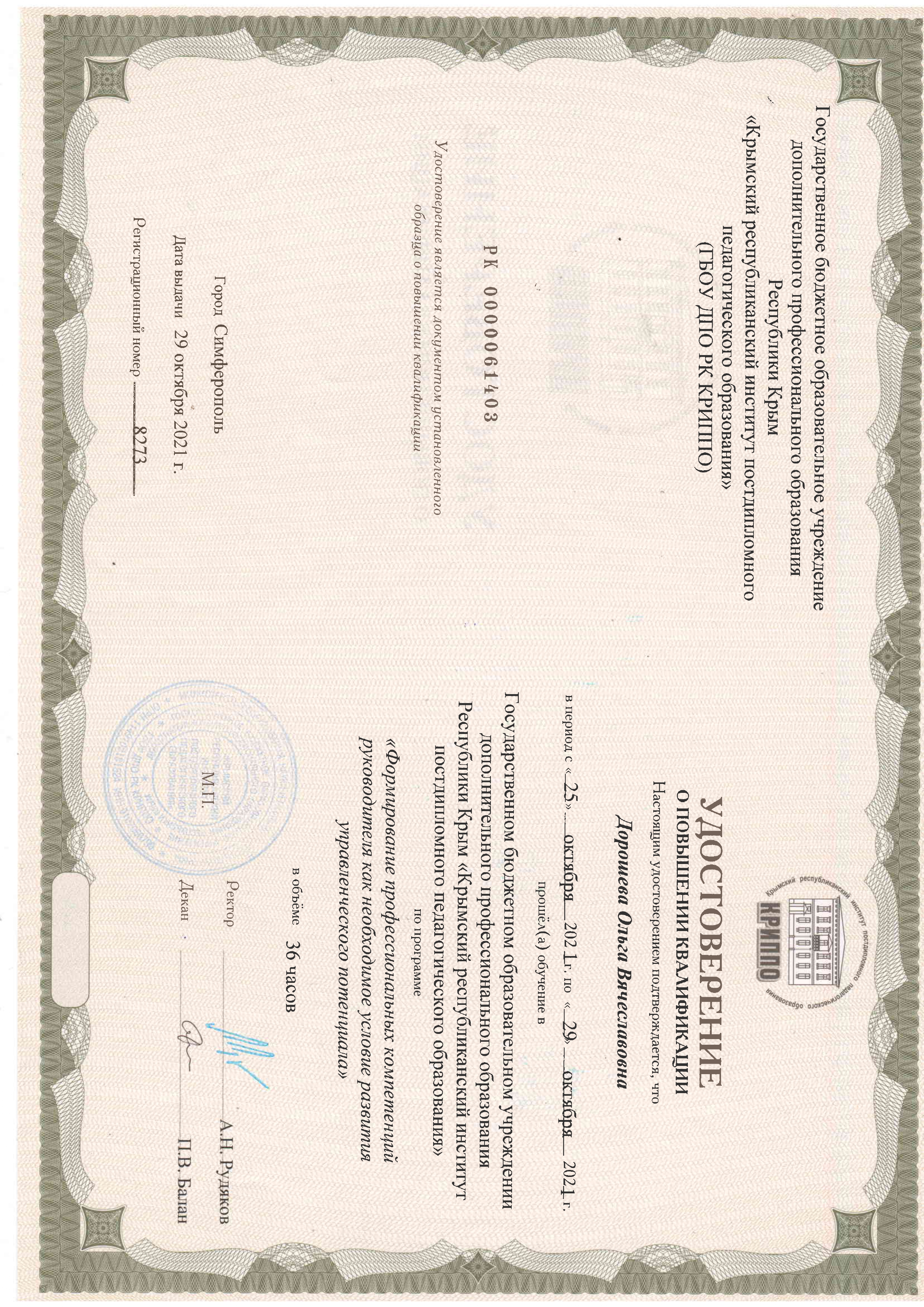 Удостоверение о повышении квалификации ГБОУ ДПО РК «КРИППО» от 29.10.2021г. № 8273 «Формирование профессиональных компетенций руководителя как необходимое условие развития управленческого потенциала» в объеме 36 часов.