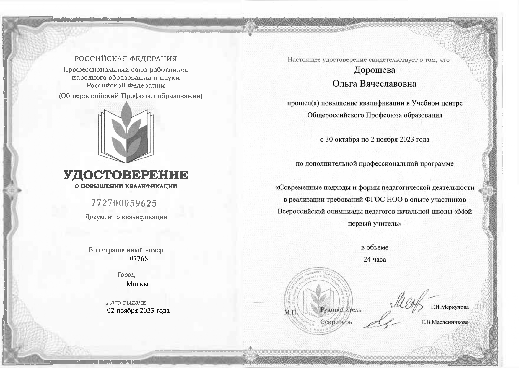 Удостоверение о повышении квалификации Учебный центр Общероссийского Профсоюза образования от 02.11.2023г. №772700059625 «Современные подходы и формы педагогической деятельности в реализации требований ФГОС НОО в опыте участников Всероссийской олимпиады педагогов начальной школы «Мой первый учитель» в объеме 24 часа