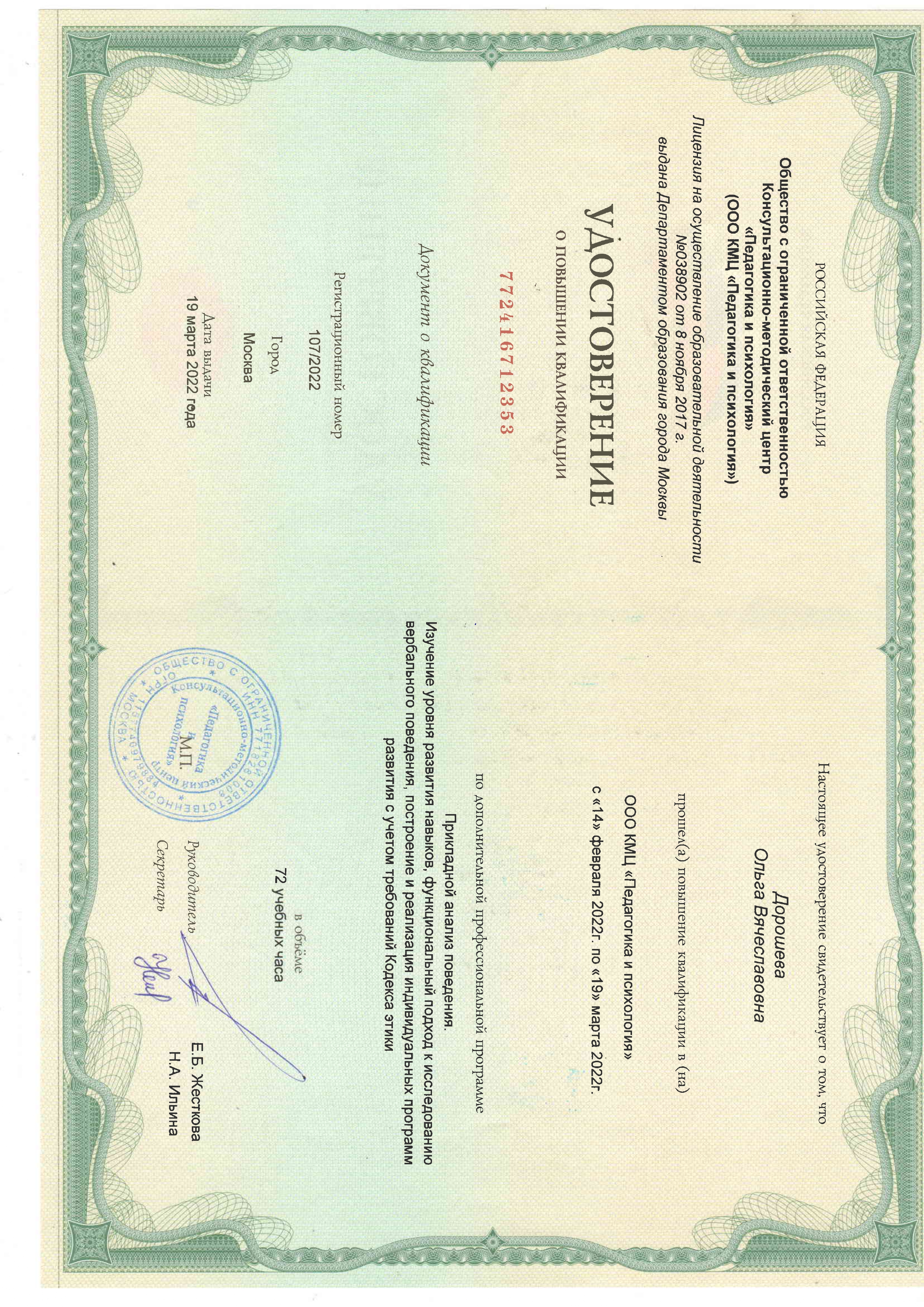 Удостоверение о повышении квалификации ООО КМЦ «Педагогика и психология» от 19.03.2022 г. регистрационный номер 107/2022 «Прикладной анализ поведения. Изучение уровня развития навыков, функциональный подход к исследованию вербального поведения, построение и реализация индивидуальных программ развития с учетом требования Кодекса этики» в объеме 72 часа.
