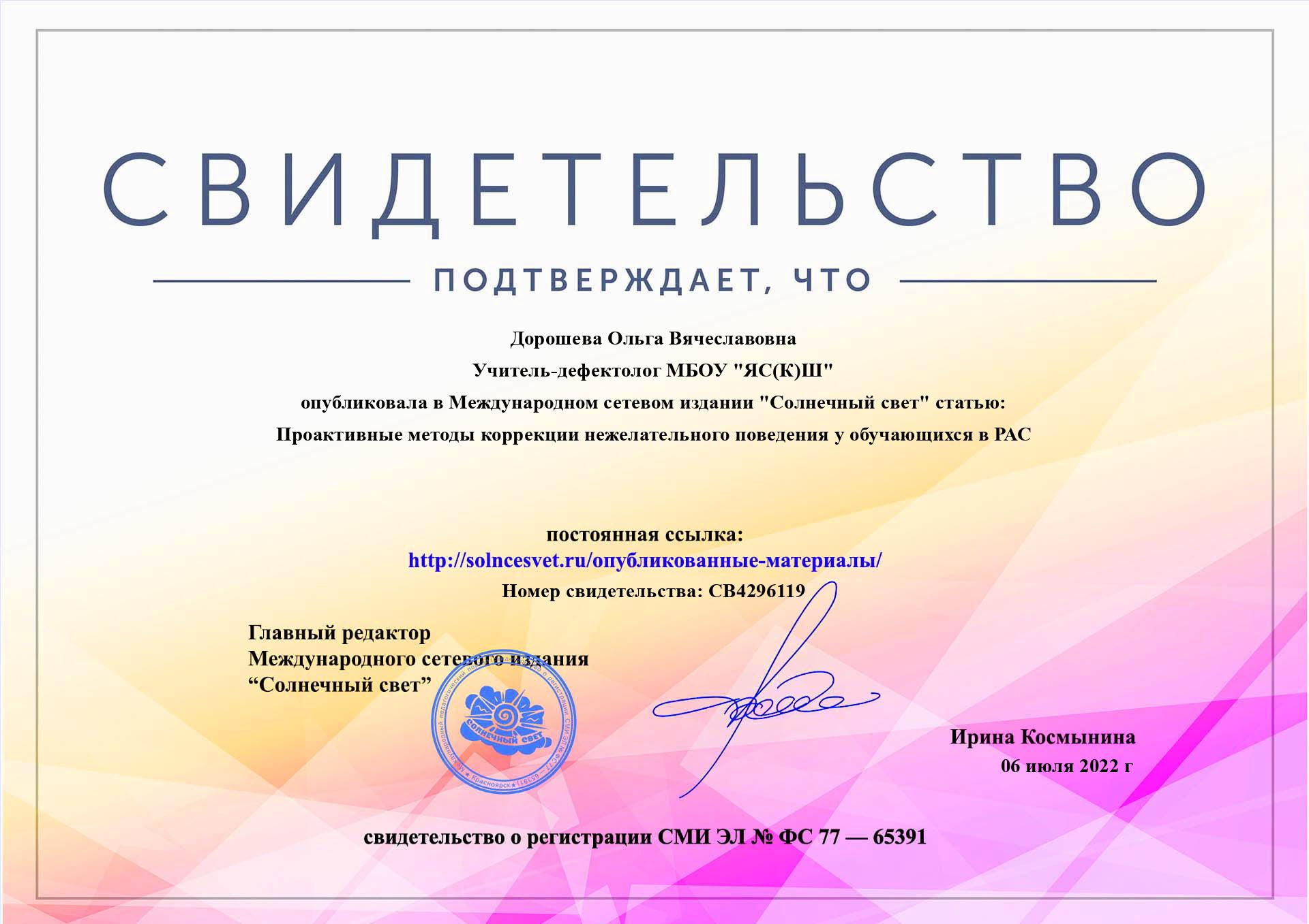 Cтатья «Проактивные методы коррекции нежелательного поведения у обучающихся с РАС» в международном издании «Солнечный свет», свидетельство СВ4296119 от 06.07.2022 г.