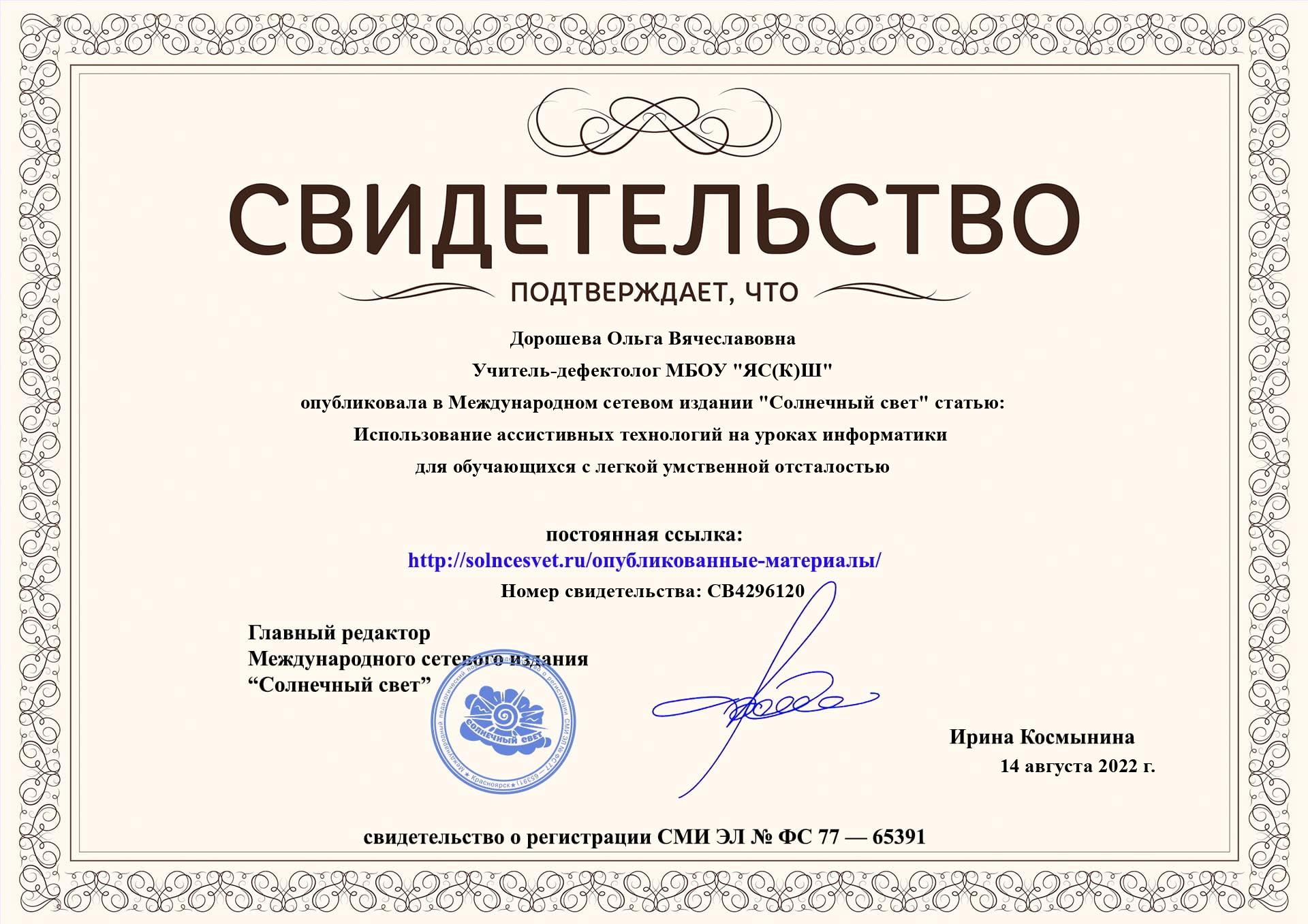Cтатья «Использование ассистивных технологий на уроках информатики для обучающихся с легкой УО» в международном издании «Солнечный свет», свидетельство СВ4296120 от 14.08.2022 г.